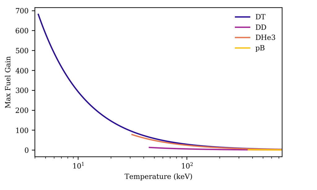 As the fuel gain is a function of temperature, we can plot it. This really makes the advantage of DT very clear. The maximum gains are a lot higher.