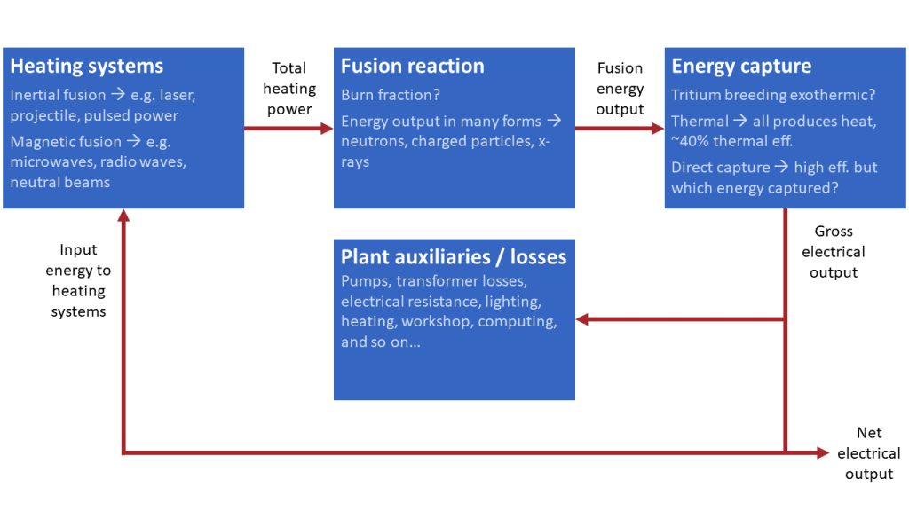 Roughly, that is. The exact nature of the definition is something that people get a bit argumentative about. Obviously, the ultimate balance is the total energy input requirement of the entire plant, balanced against the total output. The output energy is not the same as the fusion energy, there is always an efficiency associated with power conversion. Any thermal cycle, for example boiling water to make steam and turn a turbine, has a thermodynamic efficiency. And direct energy capture, as proposed by some, will not be perfectly 100% efficient. Then there are all the plant auxiliaries to run, things like pumps. Plus other losses, for example in transformers or just plain old electrical resistance. They all eat into the gross energy output.